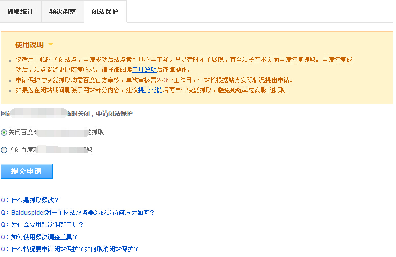 百度站长平台于今年5月底新加了一项功能——闭站保护,顾名思义,就是提供网站在特定情况下的保护措施,如网站备案、改版等,闭站保护可以减少网站闭站带来的影响。